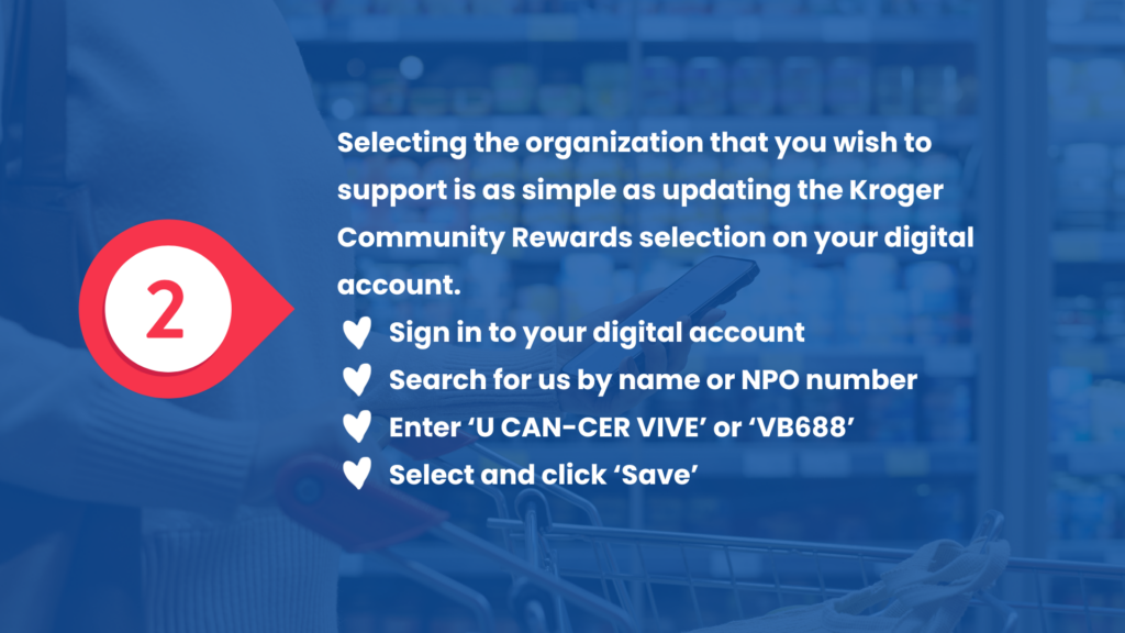 One of the ways in which we Kroger does this is through the Kroger Community Rewards program. This program makes fundraising easy by donating to local organizations based on the shopping you do every day. Once you link your card to an organization, all you have to do is shop at Kroger and swipe your Shopper’s Card. Search “U CAN-CER VIVE” or enter our Nonprofit Organization Number “VB688“
